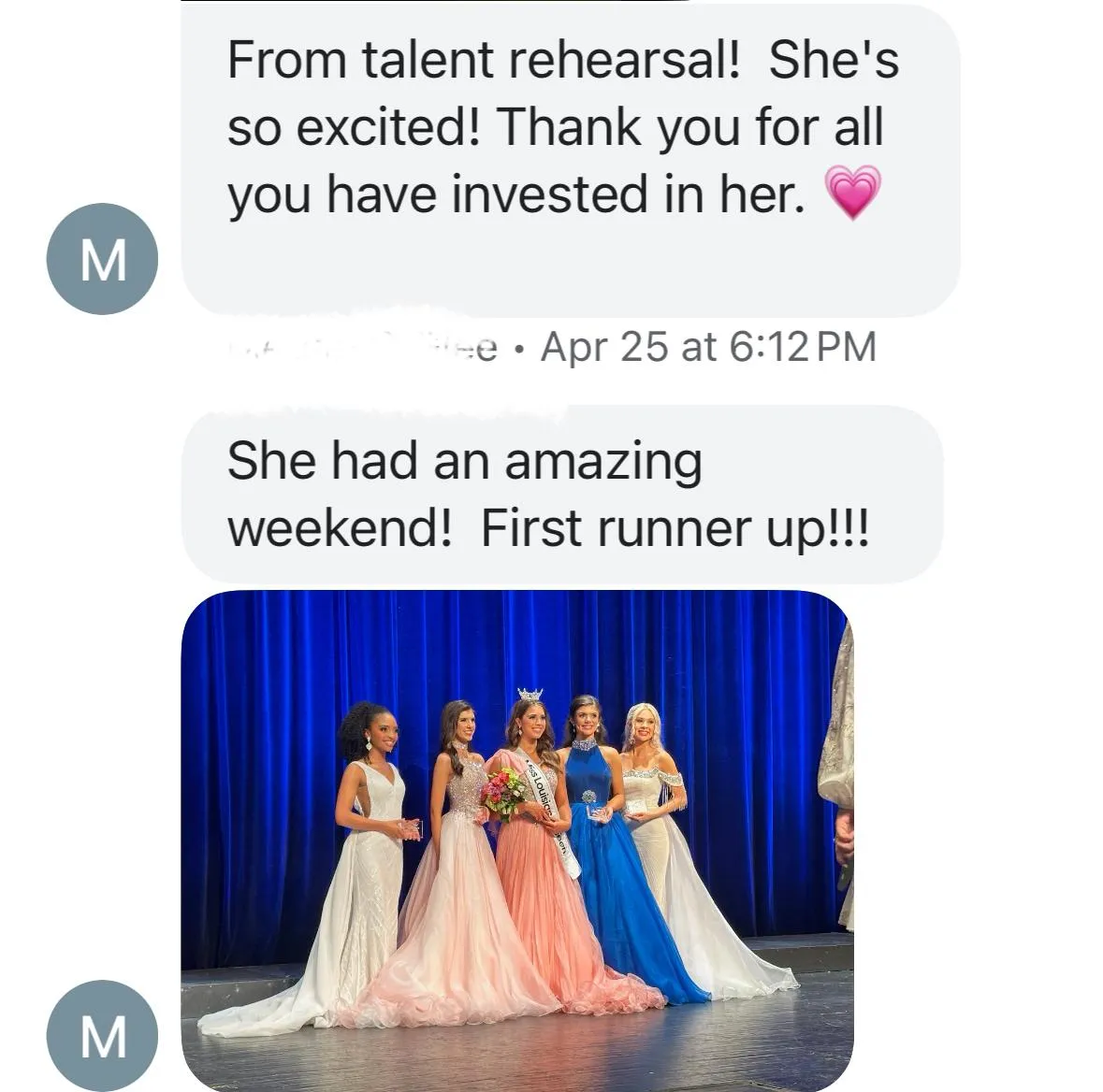 "Thank you for all you have invested in her. She had an amazing weekend, she won first runner up!!!"