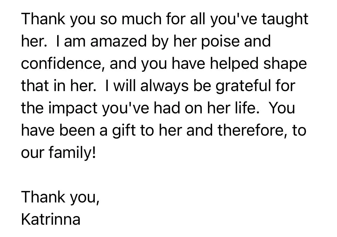 "Thank you for all of the knowledge, love, and encouragement you pour into Scarlett! I cannot wait to see how far she can go.."