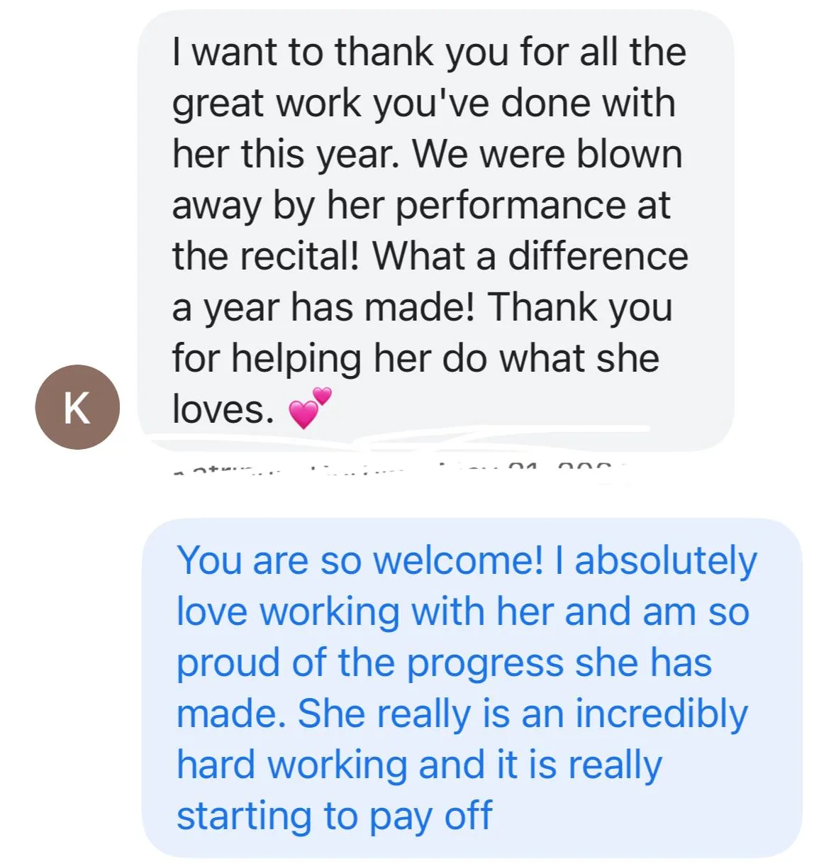 "Thank you so much for all you've taught her. I will always be grateful for the impact you've had on her life. You have been a gift to her and therefore, to our family!"