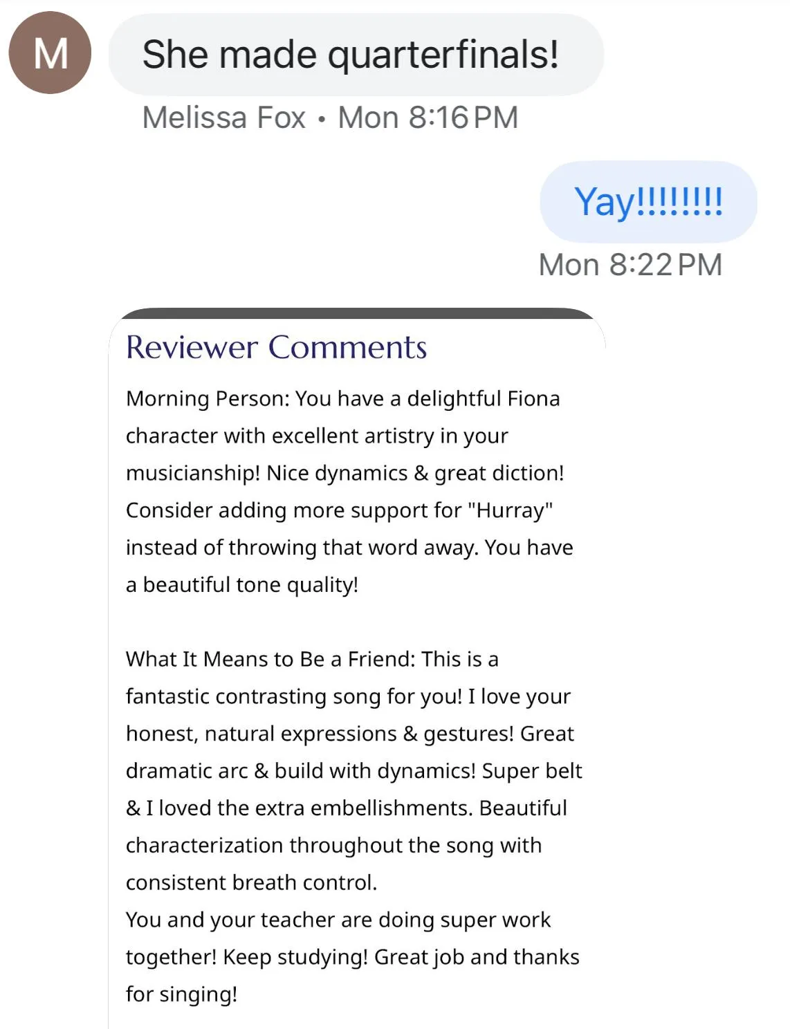 Reviewer comments: "You have a delightful Fiona character with excellent artistry in your musicianship! You and your teacher are doing super work together! Great job!"